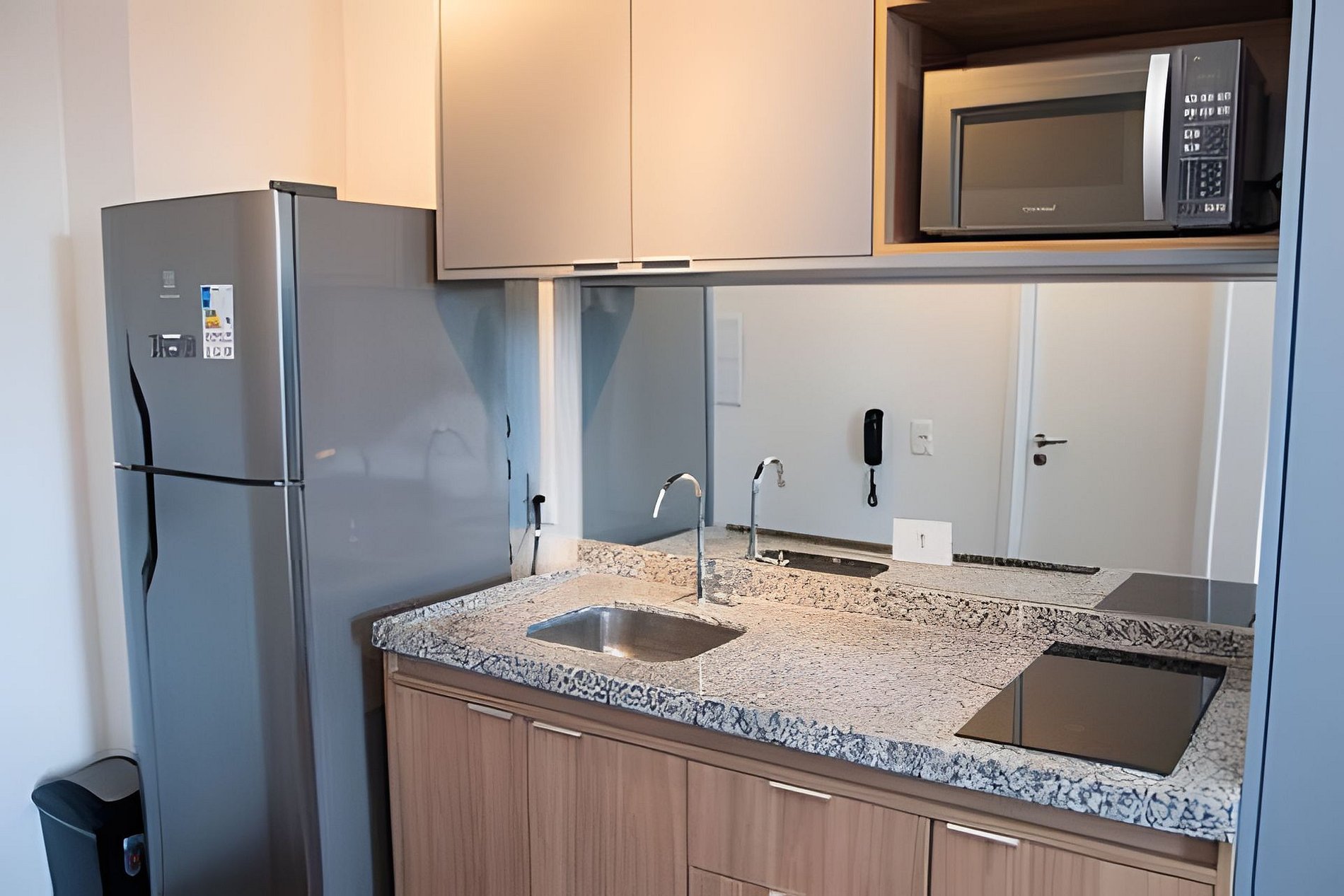 Cozinha completa equipada com fogão, geladeira, micro-ondas, utensílios e todos os itens necessários para preparar suas refeições com comodidade.