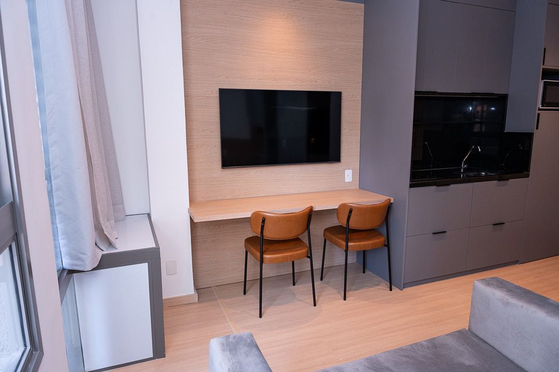 Um flat elegante com cozinha completa, ambientes iluminados e dormitórios acolhedores. Posicionado no coração paulistano. A fusão perfeita entre funcionalidade e localização privilegiada para quem busca viver a essência da cidade com conforto e autonomia