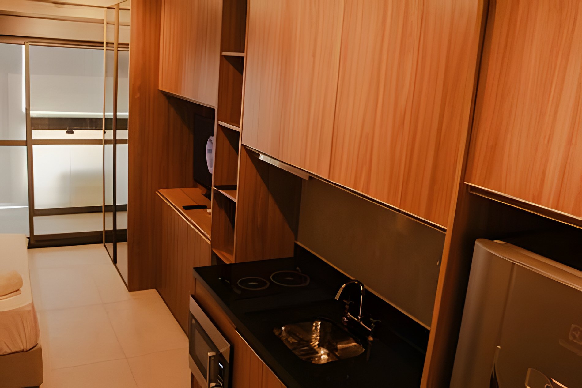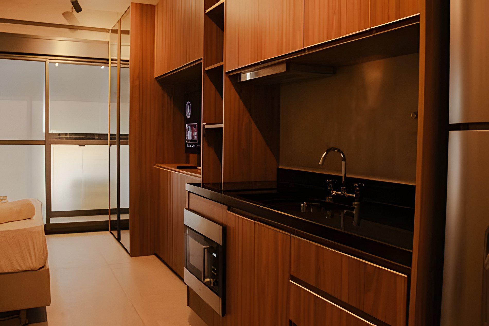 O espaço conta com cozinha totalmente equipada, incluindo geladeira, fogão, micro-ondas, utensílios, perfeita para preparar suas refeições a qualquer hora do dia.