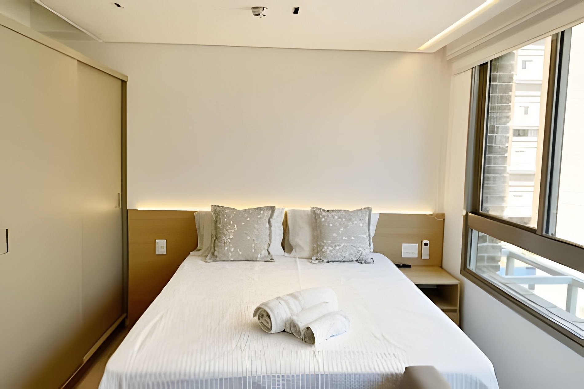 Dormitório: cama premium com roupa de cama de qualidade e amplo guarda-roupas