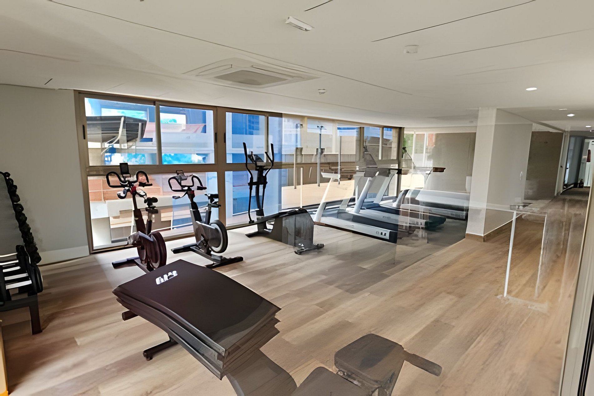Área de lazer com piscina Academia completa com equipamentos modernos