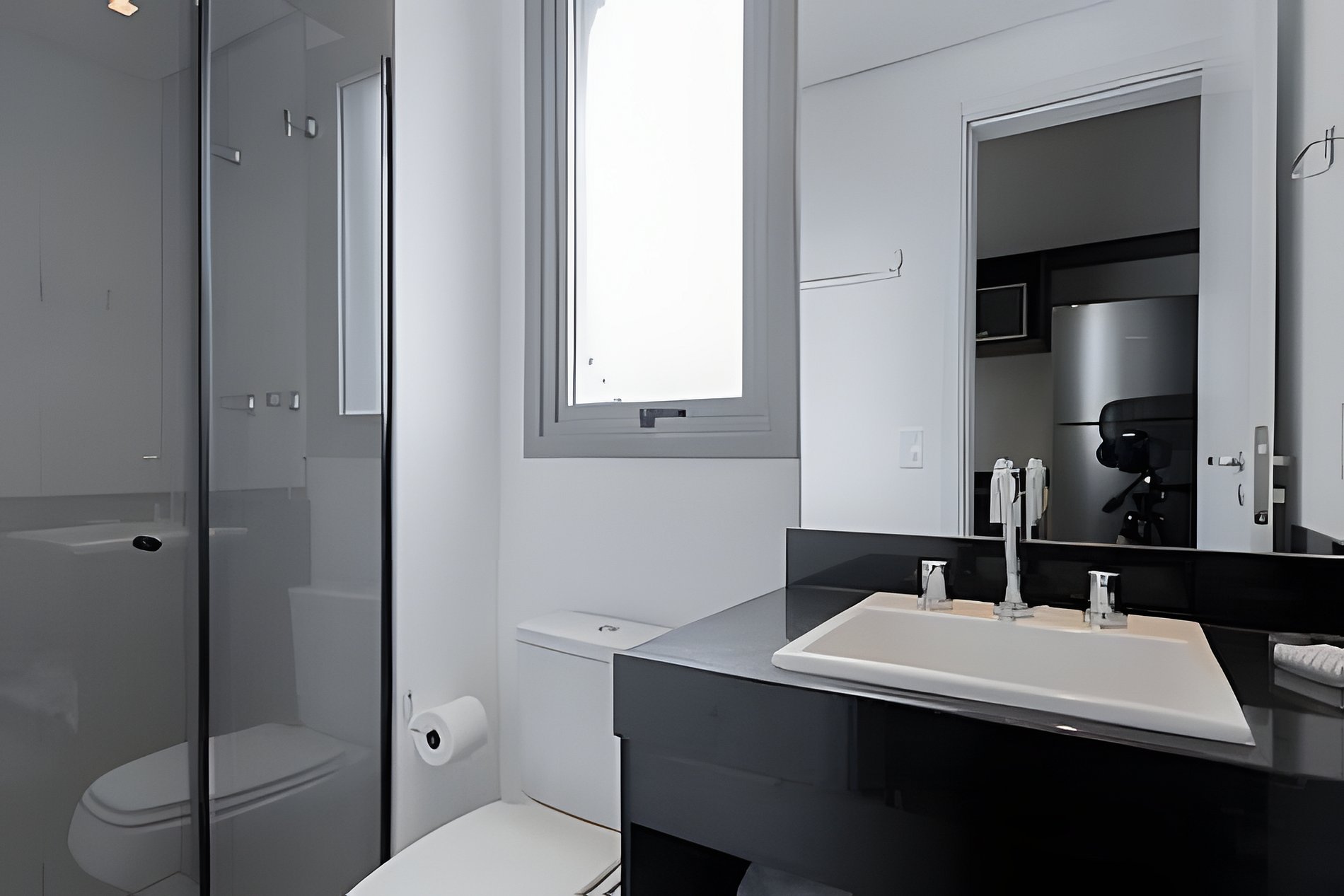 Banheiro: Equipado com chuveiro de ótimo desempenho (água quente e fria), espelho, exaustor e suporte para toalhas. Lixeira e itens de limpeza básicos estão inclusos para sua tranquilidade.