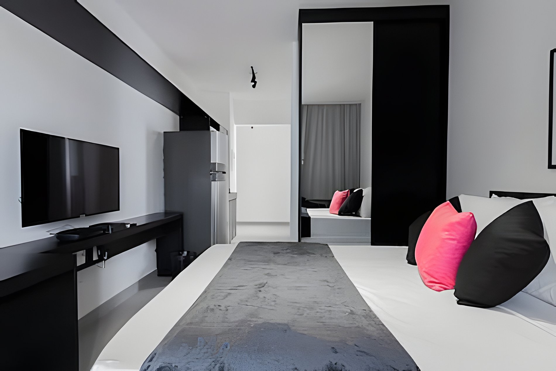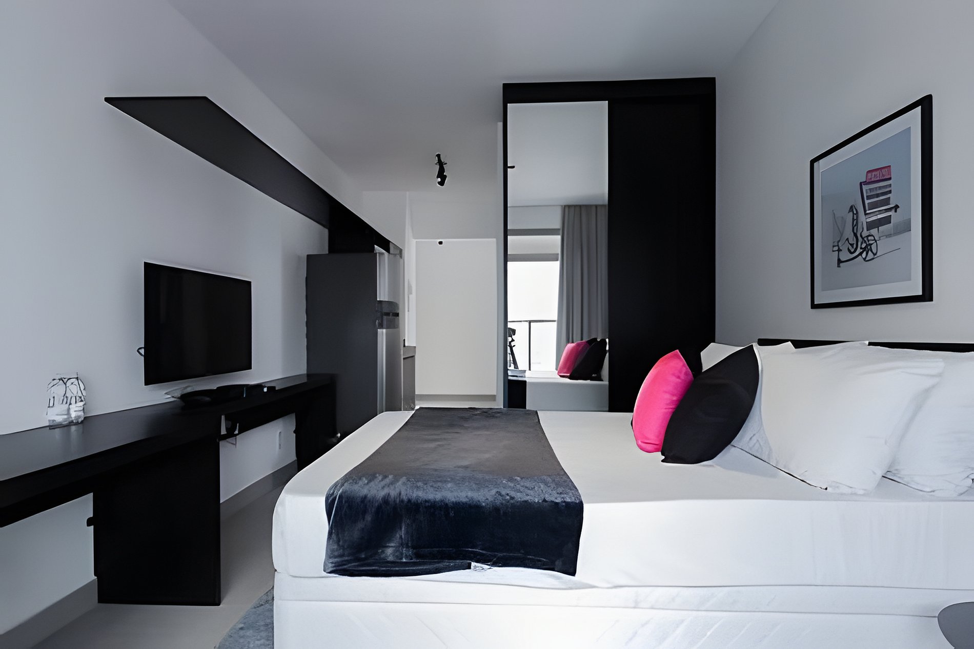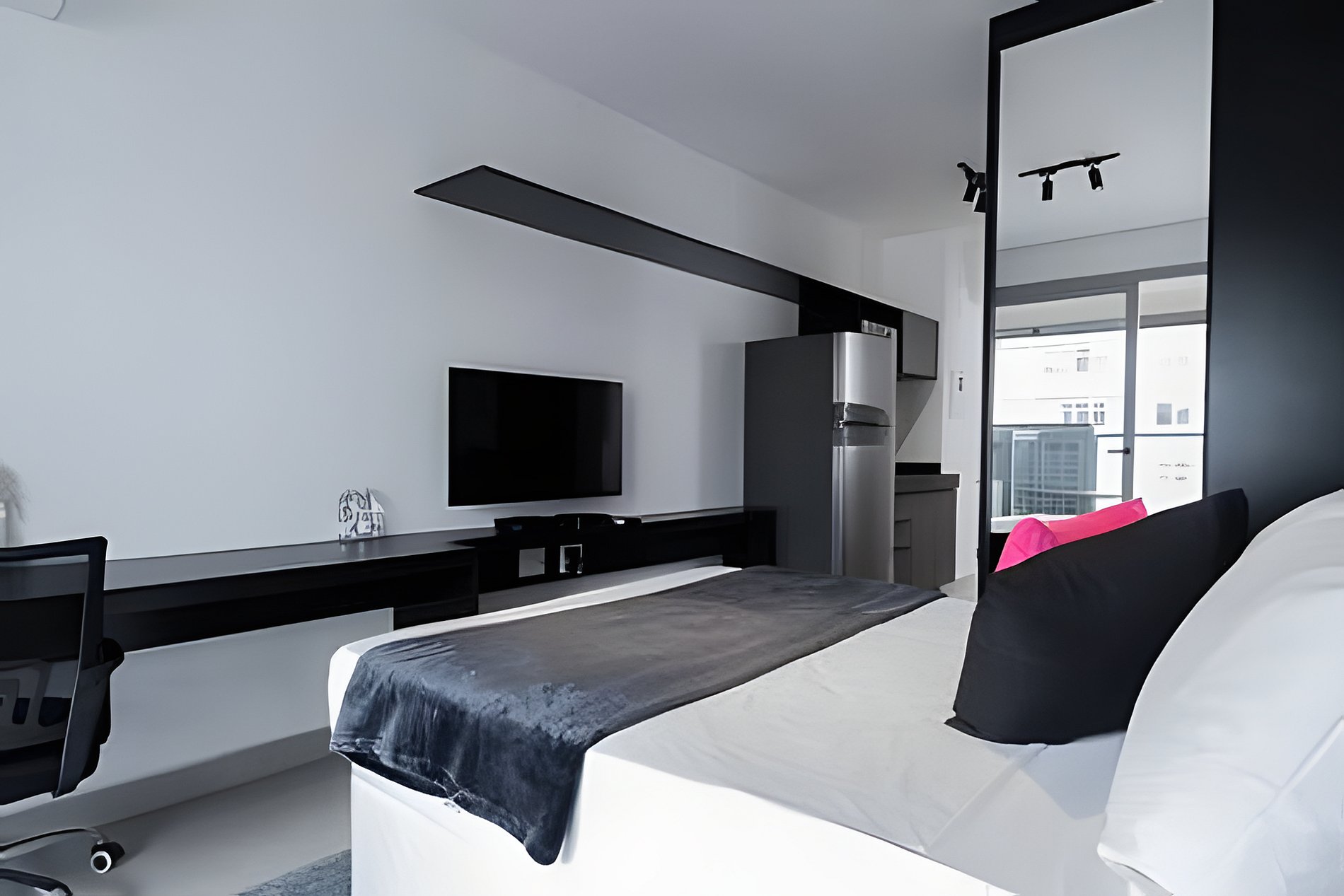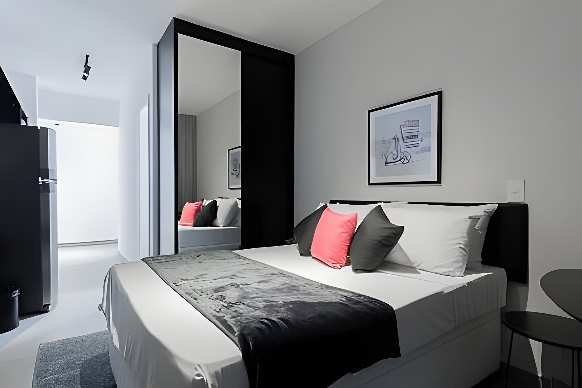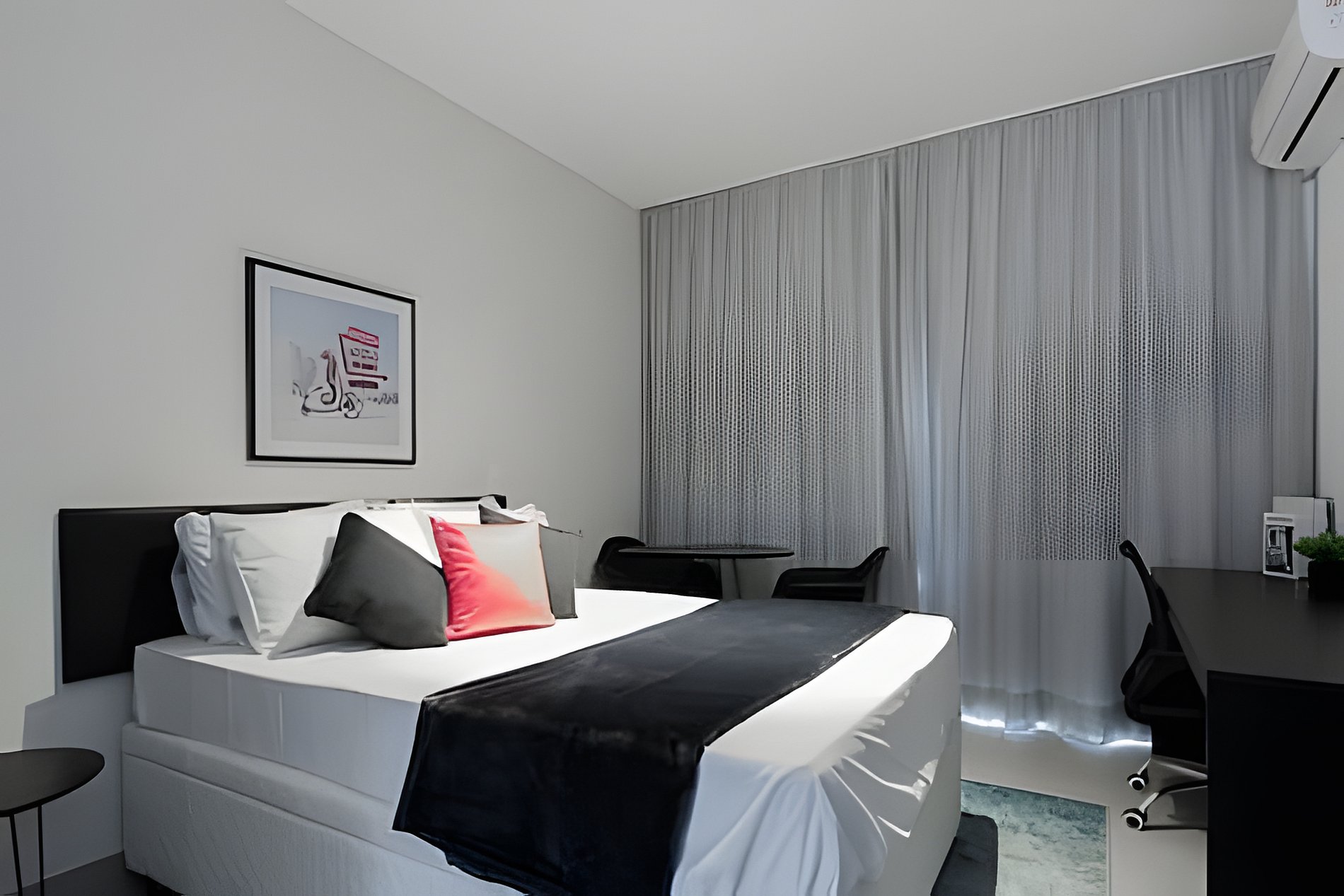 Quarto: Um refúgio relaxante com cama confortável, edredom quentinho, travesseiros macios e roupa de cama sempre fresca. O guarda-roupa espaçoso acomoda suas coisas, enquanto a TV e o ar-condicionado garantem conforto total.